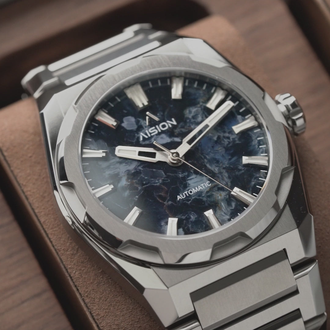 In line with the trend of natural stone dials, we have designed some different stone dials for this timepiece - one featuring a Meteorite Dial, Charoite Dial and the other a Pietersite Dial. Both dials exhibit unique refractive effects under light, making each one truly one of a kind.